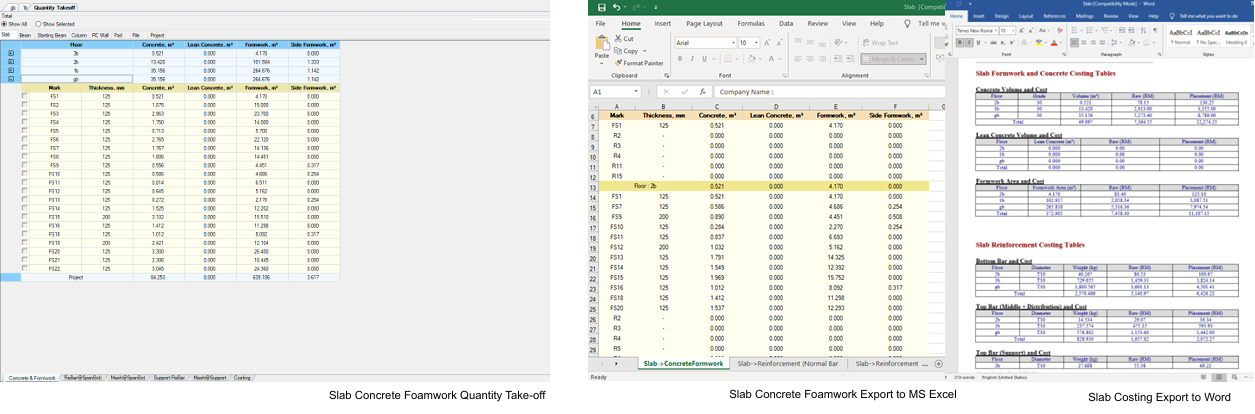 • Quantity take-off for Concrete & Foam-work, Steel Rebar, Mesh and Costing results for   Slab, Beam, Column, Wall and Footing